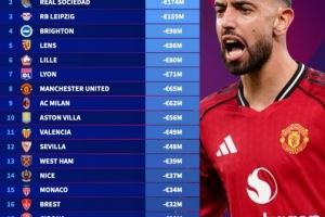 体育资讯10月24日讯 在公布了新一期五大联赛的球员身价后,德国转会市场盘点了今年五大联赛球队身价跌幅情况,其中勒沃库森下跌1.83亿欧最多,曼联和米兰分别下跌6500万欧元和6200万欧元,位居第8位和第9位。