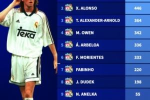 曾效力利物浦、皇马球员为两队总出场次数排行:阿隆索446场第二